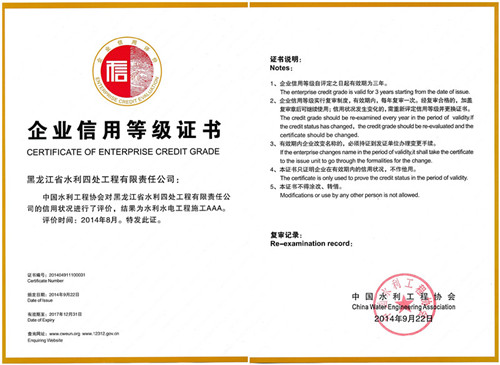 水利水電工程施工企業(yè)AAA信用等級(jí)證書(shū)